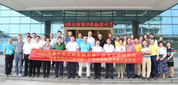 市政协副主席、工商联主席黎四龙,市委统战部副部长、工商联书记李忠南,南宁市工商联(商会)领导 、南宁市工商联第十四届执委会常委、特邀商会和企业代表,以及市委统战部、工商联有关部室负责人、经开区党工委管委会书记覃传财等39人参加考察调研活动。刚刚在5月18日召开的南宁市工商联第十四次代表大会上,当选为南宁市工商联副主席的我集团公司总裁黄伟文携公司相关部门负责人热情迎接并陪同考察。