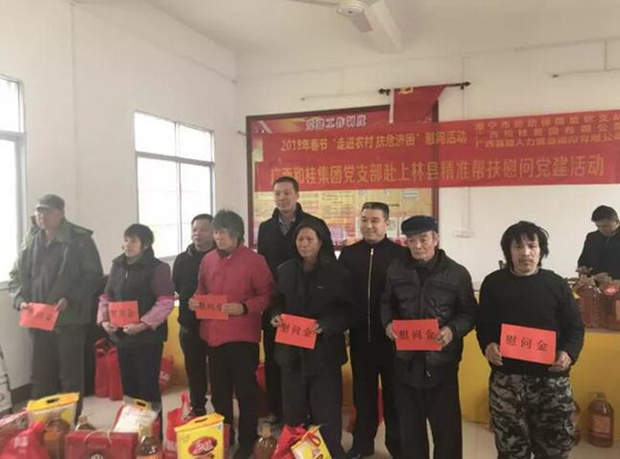 寒冬送温暖,爱心满和桂值2018年新春佳节即将到来之际,为了表达对困难户、低保户和贫困党员的关爱和帮助,让他们度过一个快乐、平安、祥和的新春佳节。2018年2月2日,广西和桂集团党支部书记周云同志、人力行政总监梁伟同志等一行四人代表集团公司,会同我们的联建单位-南宁市劳动保障监察支队党支部书记赵斌同志带领的支部成员,一起到南宁市上林县白圩镇龙楼村开展“寒冬送温暖,爱心满和桂”的精准扶贫,慰问贫困户家庭的党建活动。慰问团一行深入农村,走进贫困家庭,为他们送去了慰问金和油、米、保适洁洗衣液、节日礼包等生活用品,送去了集团公司的关怀和温暖。