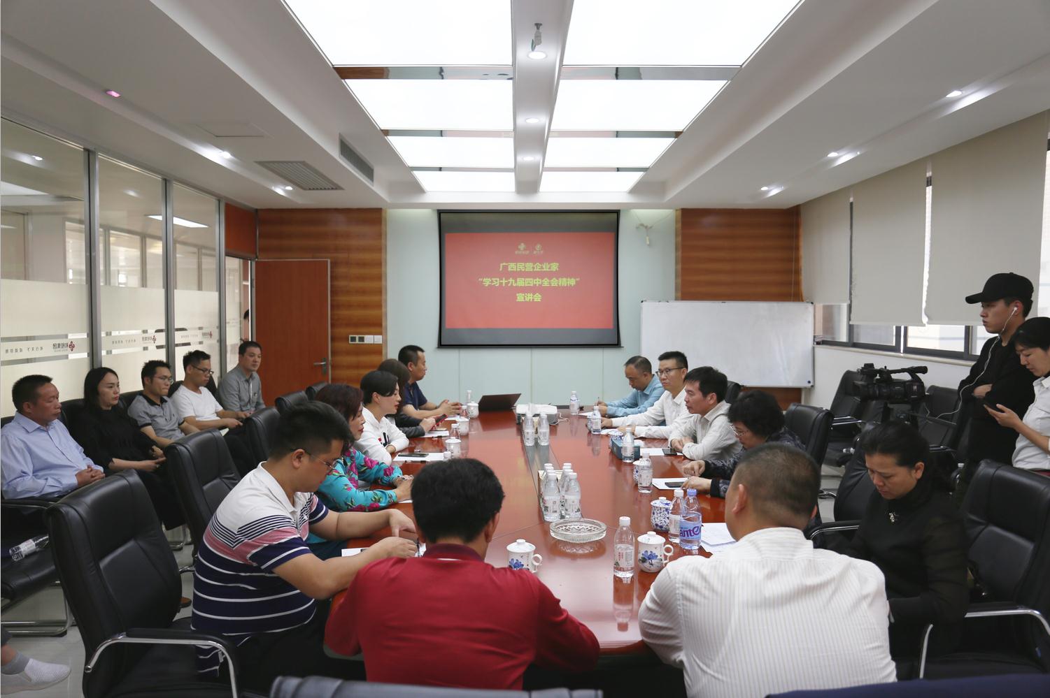 11月23日,广西自治区党委统战部副部长、工商联党组书记熊春寒同志,率领广西民营企业家学习贯彻党的十九届四中全会精神宣讲团一行30人到和桂集团开展宣讲活动,和桂集团总裁黄伟文携集团高管进行了热情接待。