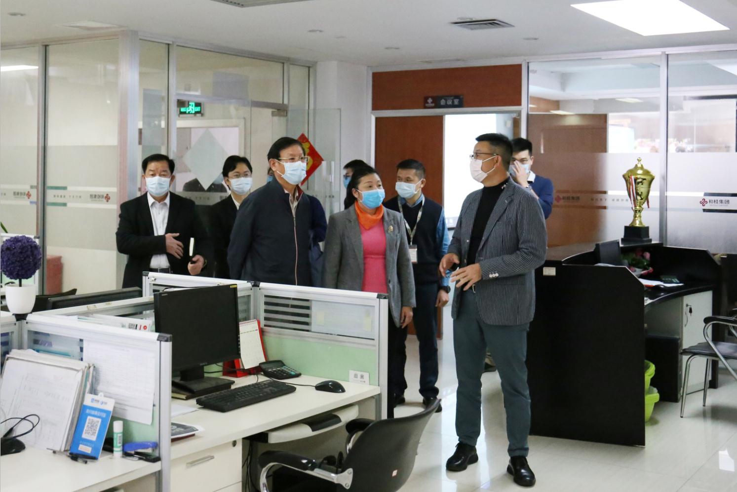 陈世平主席一行在黄总的带领下,首先巡视了和桂集团各分子公司办公区,查看员工到岗及企业疫情防控落实情况。黄总表示,为了响应国家号召,安全复工复产,公司作了周密部署,加强园区防控演习;制订了《复工管理规定》、《和桂集团公共场所文明防疫六条公约》、《和桂集团入园全流程防护指南》等制度。园区执行封闭式管理,人员进出须佩戴口罩、测量体温并登记;全公司区域每日进行消毒卫控;为员工配发口罩、在办公区摆放免洗手消毒用品,确保员工安全;实行员工分批错峰就餐制等措施,全力确保员工安全、生产安全。