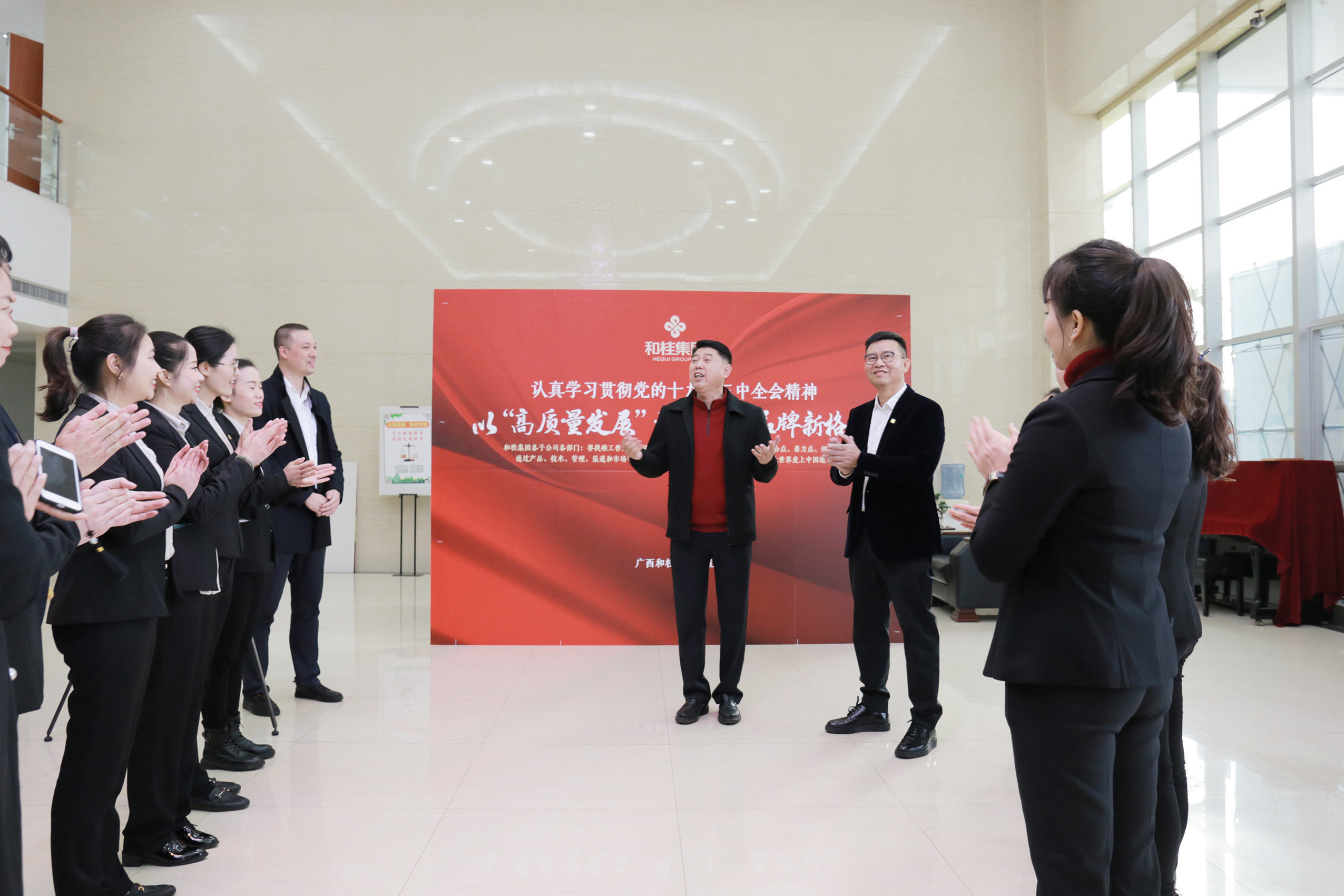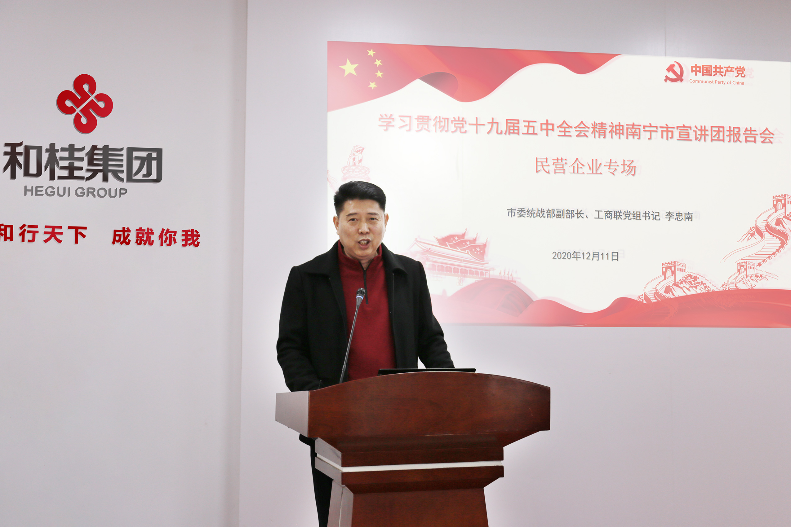 南宁市委统战部副部长、市工商联党组书记李忠南,认真传达了党的十九届五中全会精神,号召大家学习劳模精神、工匠精神,做新时期的奋斗者。通过生动的视频和案例,特别是外籍人士对中国的认识,以及对战斗英雄、国家功勋李延年故事的讲述,让大家感受到幸福来之不易,纷纷表示要做爱国敬业、守法经营、创业创新和回报社会的先锋。同时,肯定了和桂集团作为民营企业,坚定信念,跟党走,听党话,以高质量发展,开创民族品牌新格局。