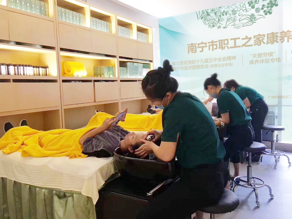 由广西中医药大学&和桂集团联合研发中心副主任甘斌,为大家带来以《康养生活从头开始》为主题的健康讲座,结合困扰大家的头皮头发问题,分享健康的养发护发知识。随后,大家分批体验了源生堂养发项目。来自基层的工会主席在体验之后表示,源生堂产品养发效果明显,值得大力推广,让广大企业职工都用得上,享受到健康福利。