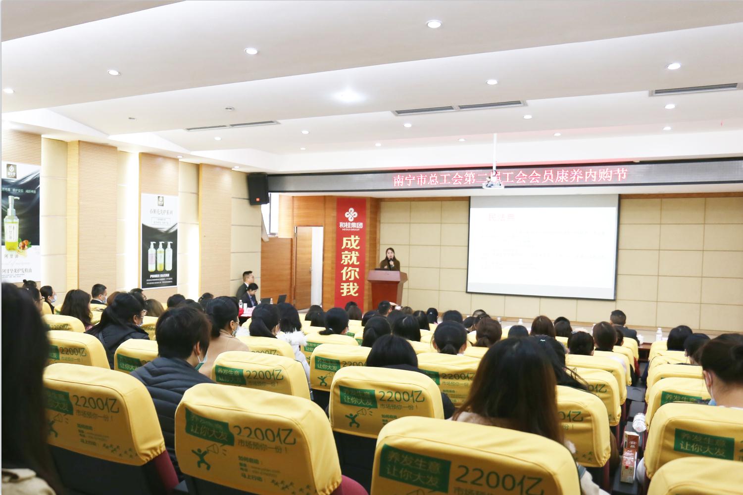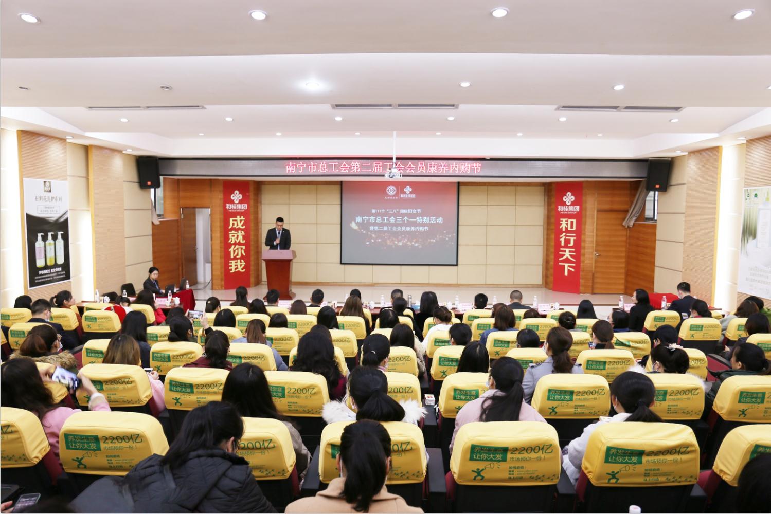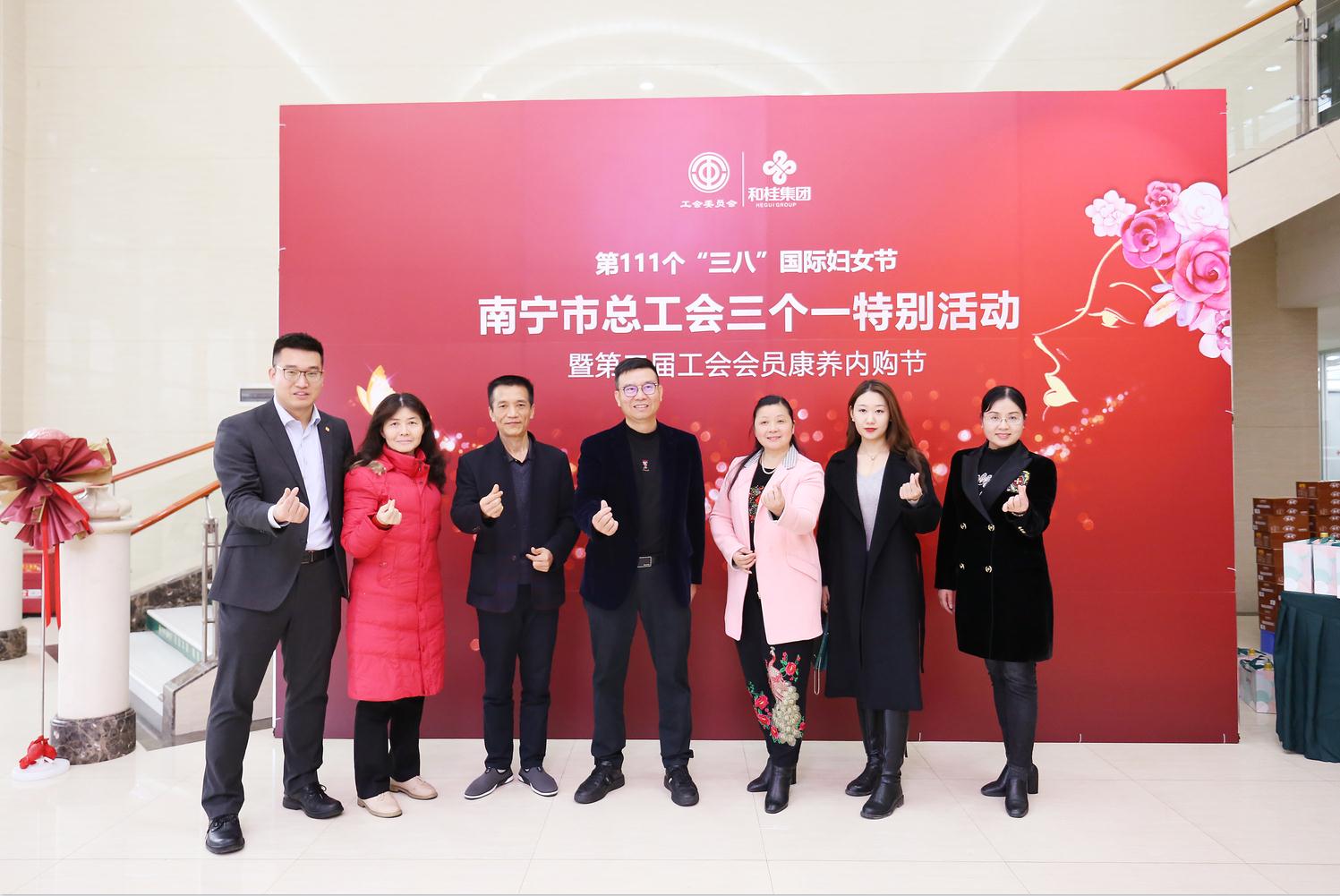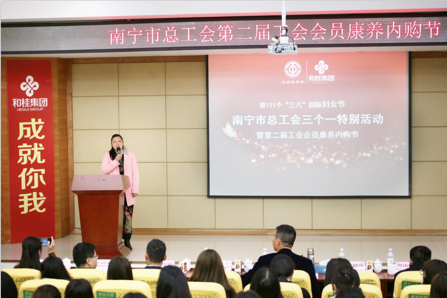 在第111个“三八”国际妇女节到来之际,为进一步激发全市女职工爱岗敬业、锐意进取的工作热情,充分发挥“半边天”的作用,3月5日,南宁市总工会走进和桂集团,开展“三个一”特别活动,通过“一场权益讲座”“一场康养讲座”“一个内购节”,与南宁市基层工会的女职工共庆节日,致敬了不起的绿城巾帼!