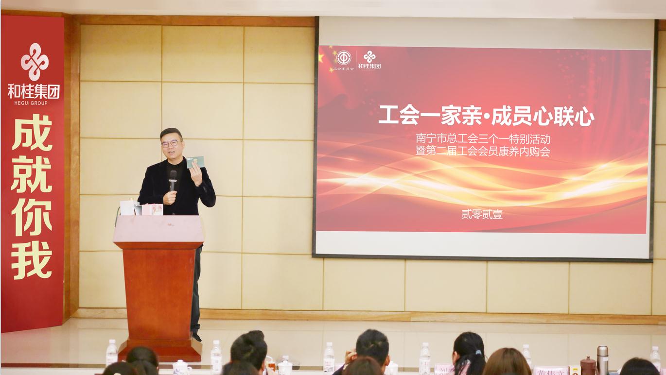 和桂集团总裁黄伟文表示,和桂集团在供应链和康养领域具有领先优势,在南宁市总工会的指导下,集团工会积极创新,服务得到很大提升。希望与各级工会系统加强交流合作,普惠职工,让广大职工享受到健康的生活方式,在个人及家庭日常消费上也能享受到真正的实惠。