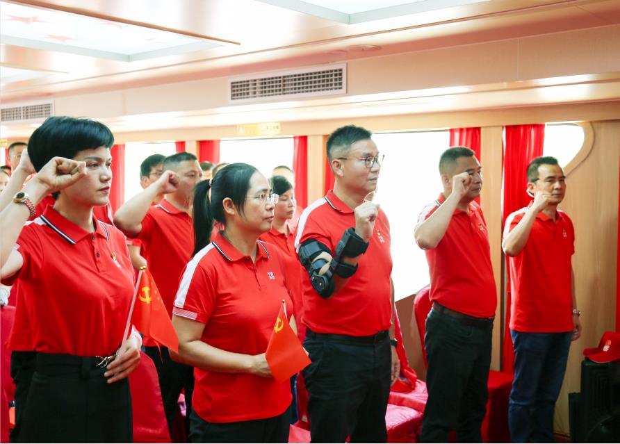 和桂集团23年来取得的成绩,离不开党的正确领导,离不开各级党委政府的大力支持,离不开广大党员以及和桂家人的齐心努力。和桂集团党支部成立于2009年,连续多年被评为“四星党支部”和“两新党组织”,76%的集团中高管是共产党员,在公司发展中发挥着模范带头作用。不记初心,牢记使命,登船后进行的第一项议程“重温入党誓词”,和桂集团全体党员面向鲜红的党旗,高举右拳,字字铿锵,重温入党宣誓的庄严承诺和坚定决心,接受心灵的净化和洗礼,牢记共产党员的政治责任和历史使命,不断保持共产党员的先进性,听党话、跟党走,以更加饱满的热情投身工作,启航新征程。