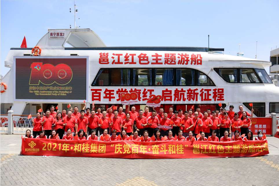 据悉,和桂集团此次举行的邕江红色主题游船活动,由中共南宁市委、文化广电和旅游局、南宁广播电视台组织实施,且恰逢此活动开展以来的第100次启航,也是在红色主题游船上举行的第100场党史学习教育活动,意义非凡。“100年党庆+100航红船+100场党课+23周年司庆”四喜汇聚,令全体和桂家人倍感荣幸、深受鼓舞,共盼奋斗不止、胜利不断。