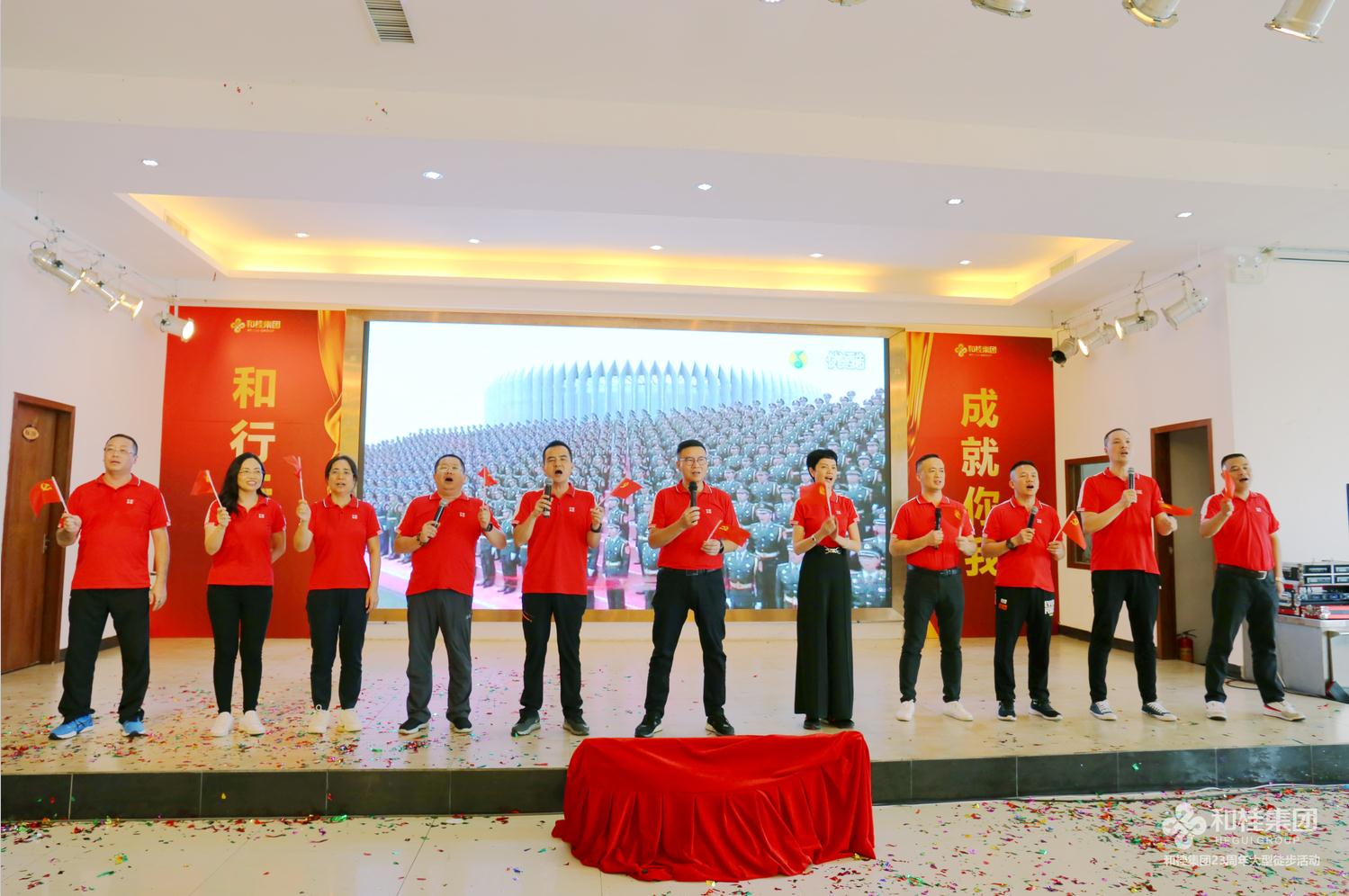 和桂家人组成“100”字样队形,手挥党旗,齐声高唱《没有共产党就没有新中国》,用昂扬的歌声,共庆建党百年,拉开司庆徒步活动帷幕。