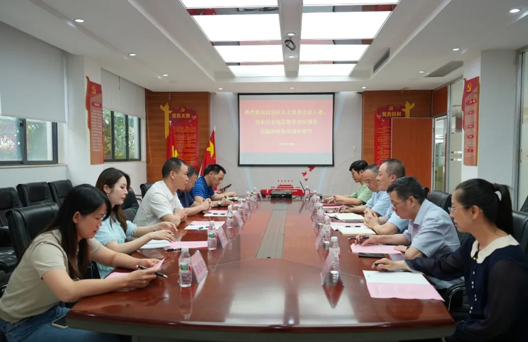 自治区人大常委会法工委副主任龙宪华,自治区市场监管局二级巡视员、知识产权局副局长杨晓东,自治区人大常委会法工委法规三处处长阳文静,自治区市场监管局知识产权保护处处长梁涛,自治区人大常委会法工委法规三处副处长黄盛欢,自治区市场监管局知识产权保护处一级主任科员张文军,南宁市市场监管局副局长谢义平,南宁市市场监管局知识产权促进科科长刘万娴,南宁市市场监管局知识产权保护科科长唐向荣等一同参加调研。