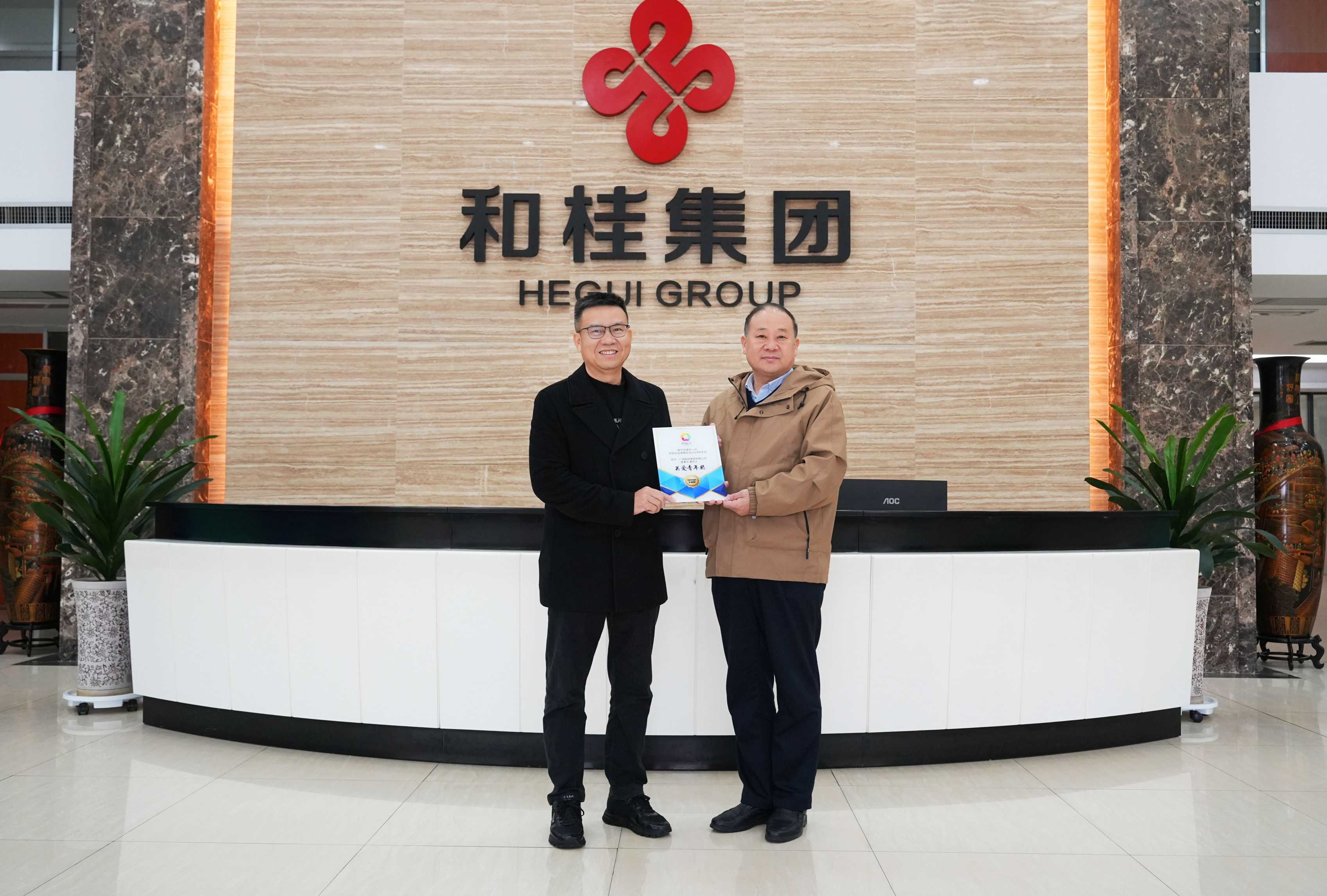 最后,张献辉副部长代表南宁市委市政府为和桂集团送上2024年新春祝福和慰问金,并为集团董事长黄伟文获评“关爱青年奖”授牌。